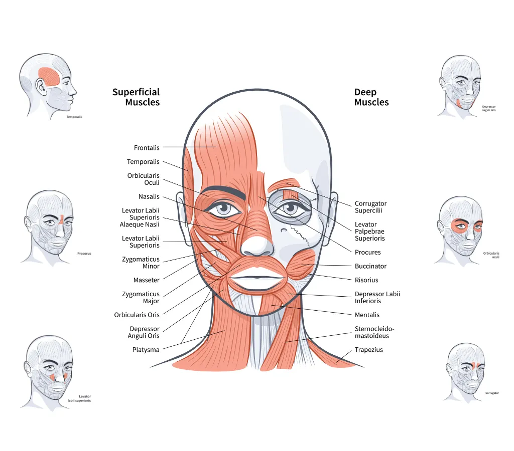 Detailed instructions for injections on frown lines, crow's feet, masseters, chin, sad mouth, forehead (frontalis), migraines, bunny nose, gummy smile, smoker lines, hands, and feet.